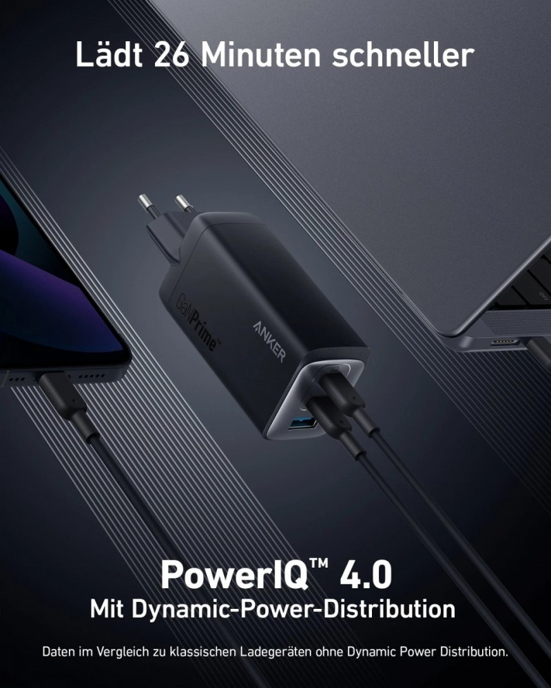 Potrójna moc: dzięki 2 portom USB-C i portowi USB-A możesz jednocześnie ładować smartfon, tablet i notebook za pomocą jednej ładowarki lub wykorzystać całe 100 W na jedno urządzenie!