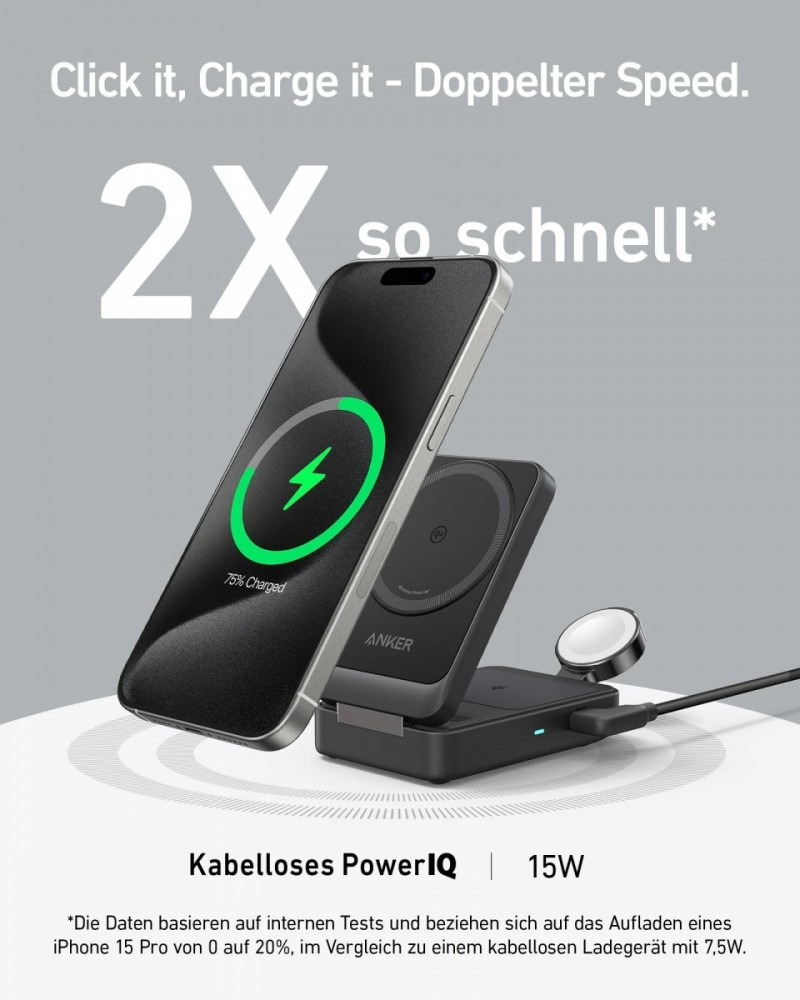 Możesz teraz ładować magnetycznie swojego iPhone'a z dwukrotnie większą szybkością dzięki PowerIQ firmy Anker, naszemu najinteligentniejszemu bezprzewodowemu systemowi szybkiego ładowania. Naładuj iPhone'a 15 Pro do 20% 15W