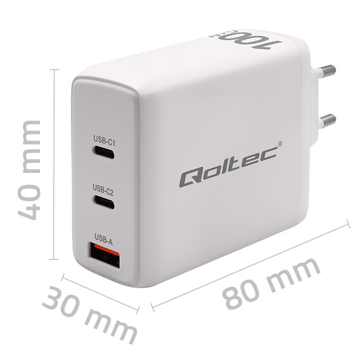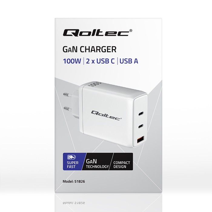 Ładowarka marki Qoltec została wyposażona w najnowocześniejszą technologię ładowania GaN polegającą na zastosowaniu nowego materiału półprzewodnikowego azotku galu. W zależności od rodzaju ładowanego urządzenia ładowarka dobiera odpowiednie napięcie i natężenie w zależności od parametrów baterii, chroniąc ją przed przegrzaniem.