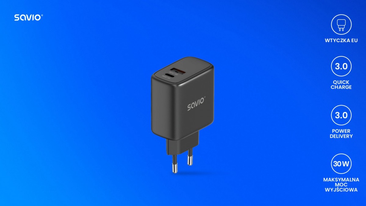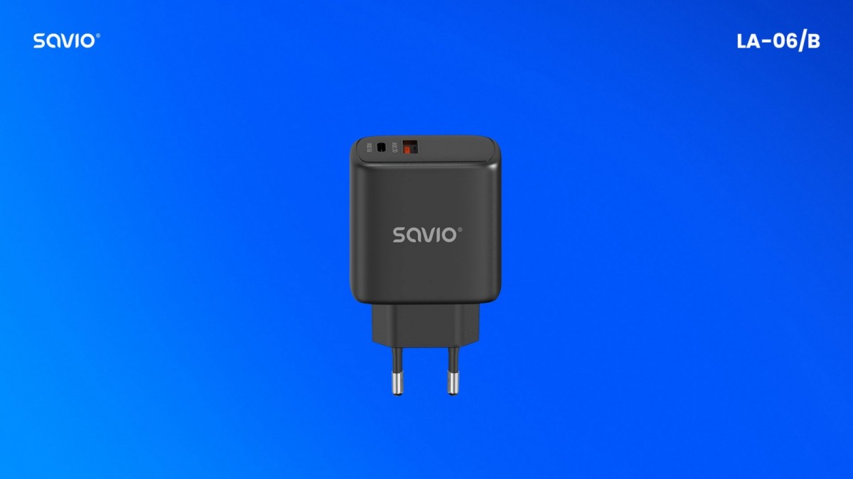 Ładowarka sieciowa SAVIO LA-06/B umożliwia jednoczesne ładowanie dwóch urządzeń poprzez standardowy port USB A oraz port USB-C. Dzięki zastosowaniu technologii ładowania Quick Charge 3.0 oraz Power Delivery 3.0 możliwe jest nawet 4 razy szybsze ładowanie urządzeń. W przypadku gdy ładowane urządzenie nie obsługuje technologii szybkiego ładowania, ładowarka dostosuje wydajność ładowania do podłączonego urządzenia.