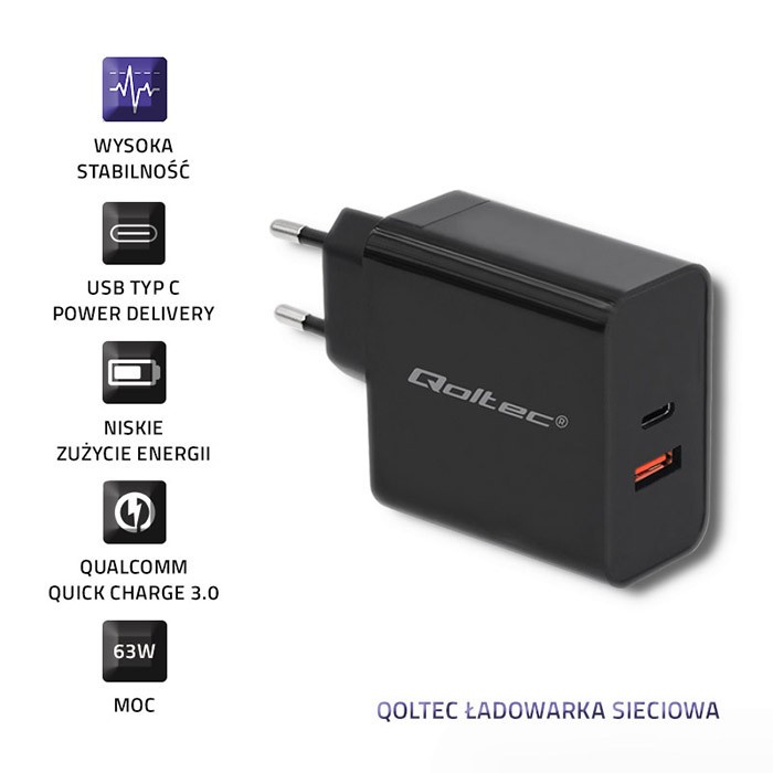 Ładowarka marki Qoltec została wyposażona w najnowocześniejszą technologie POWER DELIVERY, która dostosuje się do podłączonego sprzętu, precyzyjnie ustawiając maksymalne napięcie i natężenie wymaganego prądu. Technologia POWER DELIVERY wykorzystuje złącze USB-C. Posiada wbudowane gniazdo USB QC 3.0 oraz USB typ C PD. Jest niezwykle uniwersalna osiągając moc 63W zabezpiecza mniej wymagające urządzenia dzięki czemu bez obaw można stosować ją do wielu urządzeń różnego formatu. Możesz wygodnie korzystać w domu, w pracy lub w podróży i zasilać smartfon, tablet i inne urządzenia mobilne. Dodatkowym atutem ładowarki jest technologia QUALCOMM QUICK CHARGE. To niezwykle przydatna funkcja, która pozwala na znaczne skrócenie czasu ładowania w porównaniu ze standardową ładowarką. Ładowarka dostosowuje parametry do potrzeb urządzenia by dostarczyć jak największą moc w jak najkrótszym czasie.