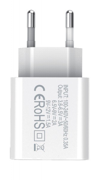 Bardzo szybka ładowarka sieciowa działająca w technologii QC3.0 Przeznaczona do ładowania telefonów, tabletów, oraz innych urządzeń ładowanych z USB Jeden port USB Wejście sieciowe: 100-240V~50/60Hz Maksymalny pobór prądu: 0,35A