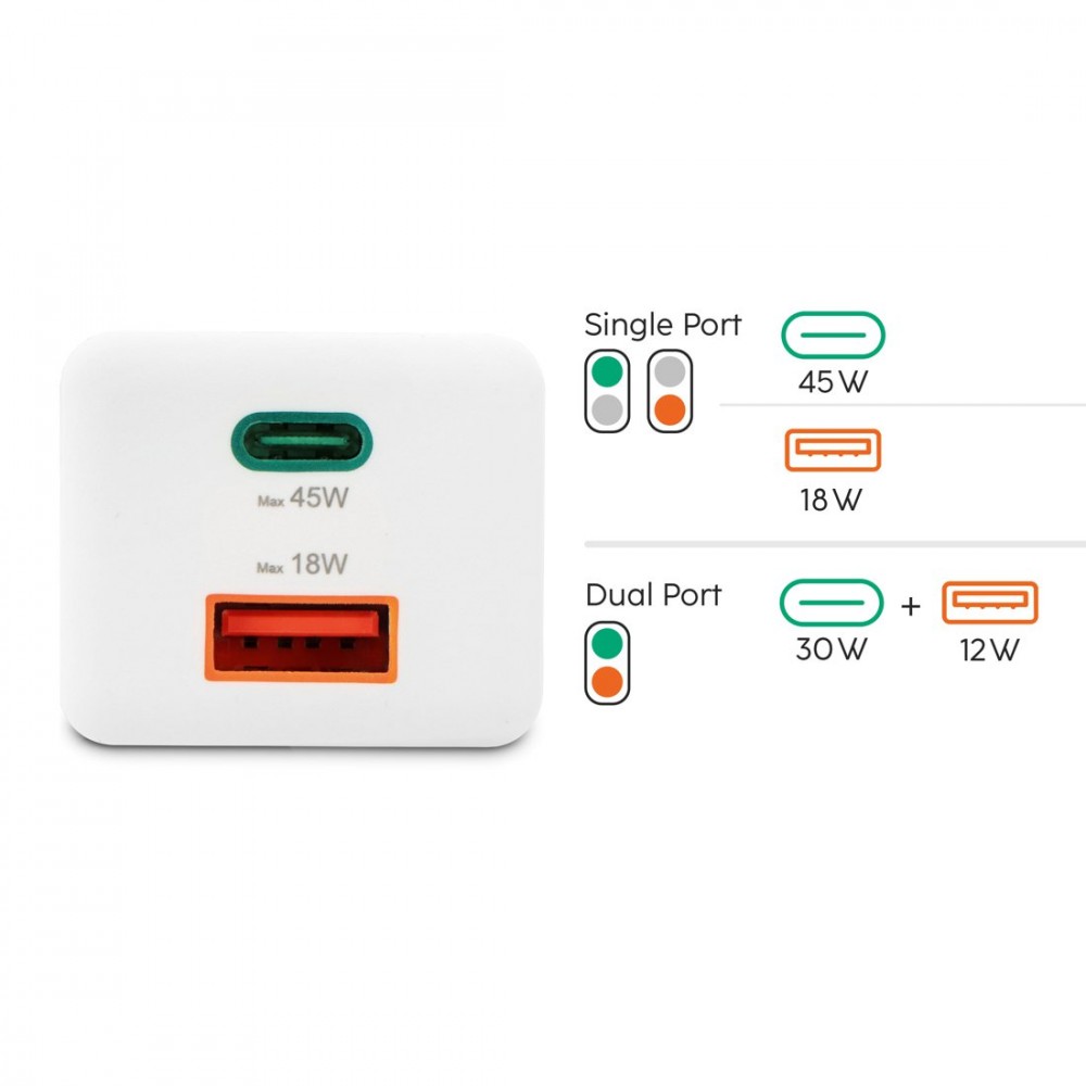 Specyfikacja: Maks. moc USB-C: 45 W Maks. moc USB-A: 18 W Maks. moc USB-C + USB-A: USB-C: 30 W; USB-A: 12 W Napięcie wejściowe: 100-240V Gniazda: USB-C oraz USB-A