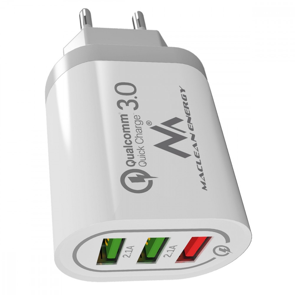 Pozostałe parametry: Aż 3 porty USB do ładowania trzech urządzeń jednocześnie. Pełna kompatybilność z każdym smartfonem, iPhonem, telefonem i innymi urządzeniami ładowanymi przez USB Najnowsza technologia Quick Charge 3.0 umożliwia ładowanie nawet 3x szybciej niż standardowe ładowarki (szybkość 5V/3A, 9V/2A lub 12V/1,5A dla portu Quick Charge oraz łącznie max. 7.2A) Automatycznie dostosowywanie optymalnej prędkości ładowania do każdego podłączonego urządzenia Oryginalny produkt marki Maclean Energy