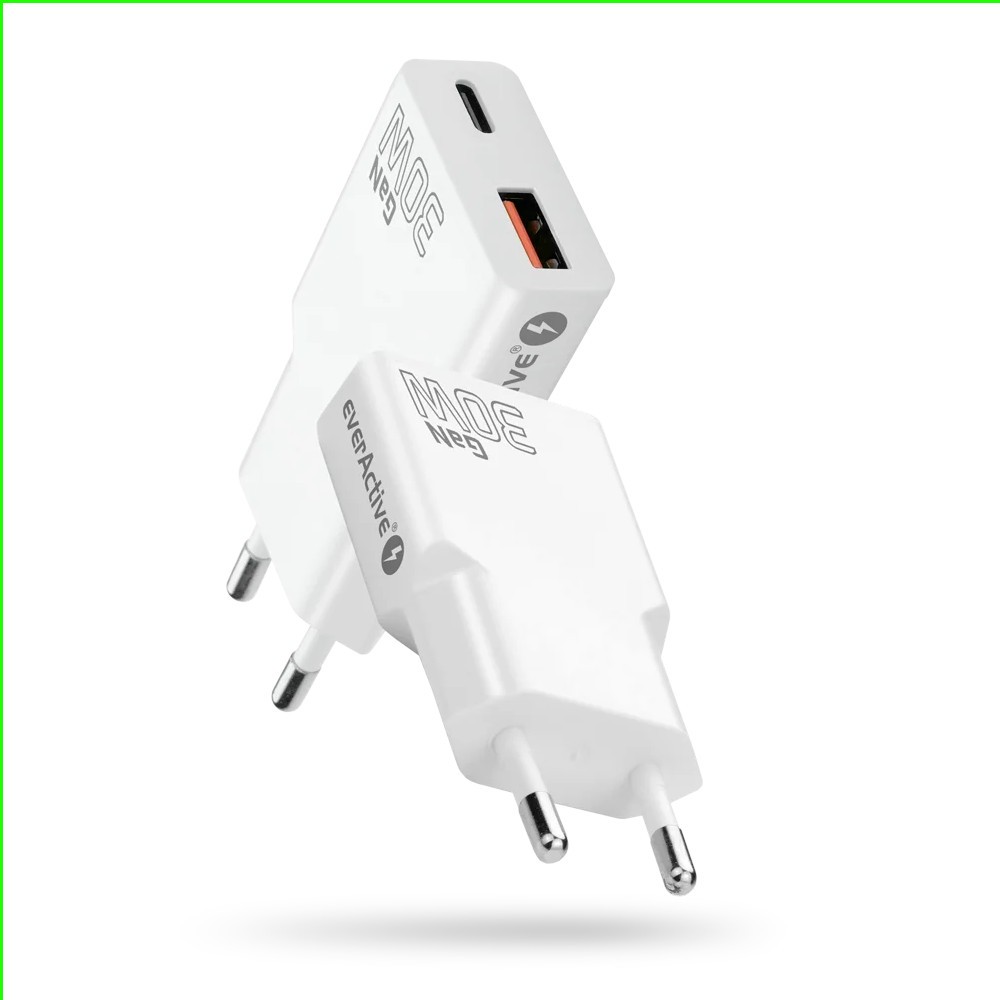 Ładowarka sieciowa everActive GaN SUPER SLIM SC-380Q z gniazdem USB QC3.0 oraz USB-C PD 30W