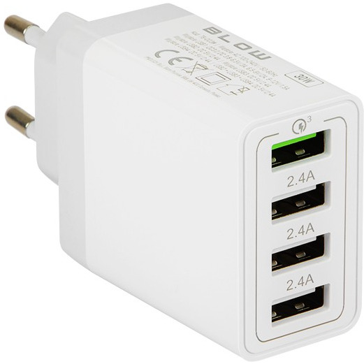 Ładowarka sieciowa z wbudowanymi czterema gniazdami USB. To wyjątkowe i nowoczesne urządzenie umożliwia ładowanie aż 4 urządzeń w jednym czasie. Urządzenie zostało wykonane z materiałów przyjaznych dla środowiska i posiada zabezpieczenie przeciwprzepięciowe. Jedna ładowarka może być używana do zasilania telefonu, tabletu oraz wielu innych urządzeń.
