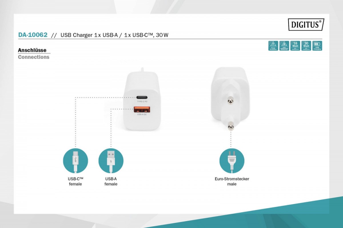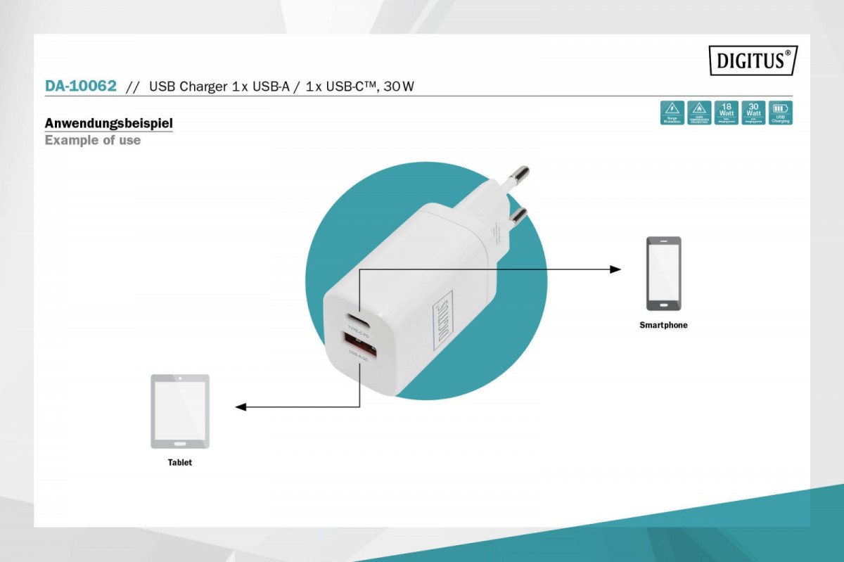 Kompaktowa ładowarka do urządzeń ze złączem USB-C (PD) i urządzeń USB-A (QC), takich jak smartfony lub tablety 2 wydajne porty umożliwiają jednoczesne ładowanie podłączonych urządzeń z dużą szybkością Obsługa prądu ładowania do 30 W kompatybilność z funkcją Power Delivery (PD 3.0) i QC3.0 Szybkie ładowanie (Fast Charge) wszystkich smartfonów: Rozwiązanie obsługuje najważniejsze protokoły szybkiego ładowania, w tym PD3.0, QC 3.0, PPS. Wysoka kompatybilność, ponieważ możliwe jest ładowanie urządzeń ze złączami USB-A i USB-C Kontrolka LED wskazująca status ładowania Obudowa z materiału ognioodpornego 1 x USB Type-C (PD) i 1 x USB-A (QC) Napięcie wejściowe: 100240 V AC, 50/60 Hz Napięcie wyjściowe USB-C, PD: 5 V / 3 A, 9 V / 3 A, 12 V / 2,5 A, 15 V / 2 A, 20 V / 1,5 A (maks. 30 W) Napięcie wyjściowe USB-A QC3.0: 5 V / 3 A, 9 V / 2 A, 12 V / 1,5 A (maks. 18 W) Wskazówka: Kiedy do obu portów są podłączone urządzenia, mają do dyspozycji wspólną maksymalną moc wyjściową 15 W (5 V, 3 A), przy czym nie jest obsługiwane szybkie ładowanie PD i QC. Obsługa funkcji Power Delivery 3.0 z mocą 18 W Zabezpieczenie przed przepięciami / zabezpieczenie nadprądowe / zabezpieczenie przed przeciążeniem / zabezpieczenie przed zwarciem Ochrona przed przegrzaniem z automatycznym wyłączaniem i przywróceniem funkcjonalności (Auto-Recovery)