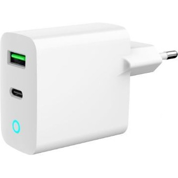 Szybka ładowarka USB 20W 2-portowa, LED, biała 20 W mocy dla Twojego smartfona lub tabletu Port typu C lub standardowy port USB do szybkiego ładowania większości smartfonów Obsługuje protokół szybkiego ładowania USB PD i QC 3.0 Praktyczny wskaźnik LED pokazuje stan ładowania