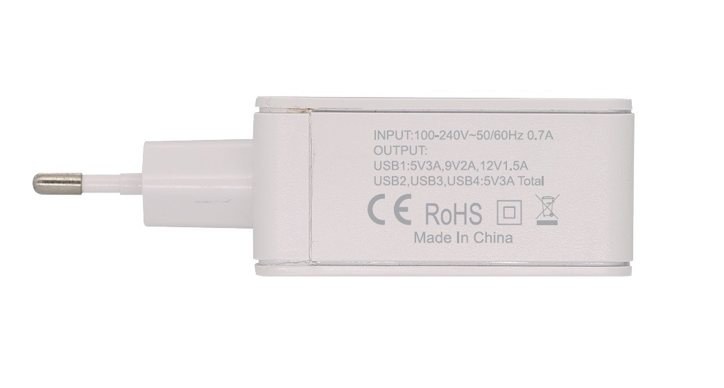 Bardzo szybka ładowarka sieciowa działająca w technologii QC3.0 przeznaczona do ładowania telefonów, tabletów, oraz innych urządzeń ładowanych z USB 4 porty USB Wejście sieciowe: 100-240V~50/60Hz Maksymalny pobór prądu 0,7A