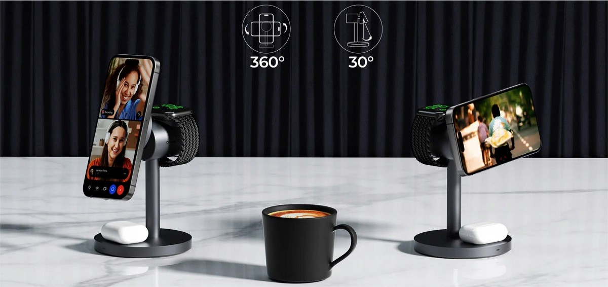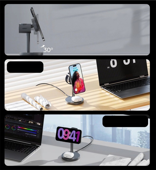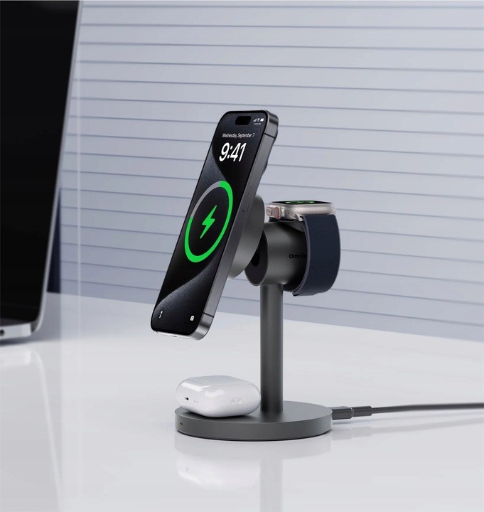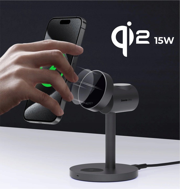 W jaki sposób naładować trzy urządzenia z jednego gniazdka elektrycznego? To proste i wygodne z ładowarką indukcyjną Aukey LC-MC311 - podłącz ją do gniazdka i ładuj do trzech urządzeń jednocześnie z mocą do 15W! Dzięki temu akcesorium pozbędziesz się problemu osobnych kabli i ładowarek do każdego urządzenia, a także utrzymasz porządek na biurku, bo ta ładowarka bezprzewodowa może służyć także jako stojak na smartphone, smartwatch oraz słuchawki! Technologia Qi2 (Qi 2.0), szybkie ładowanie 3.0 Regulacja: 30° (góra - dół) i 360° (pion-poziom) Stojak na smartwatch, smartfon i słuchawki Ładowanie do trzech urządzeń jednocześnie Certyfikat Qi 2.0 Uchwyt magnetyczny (tacka magnetyczna) Nowoczesny design