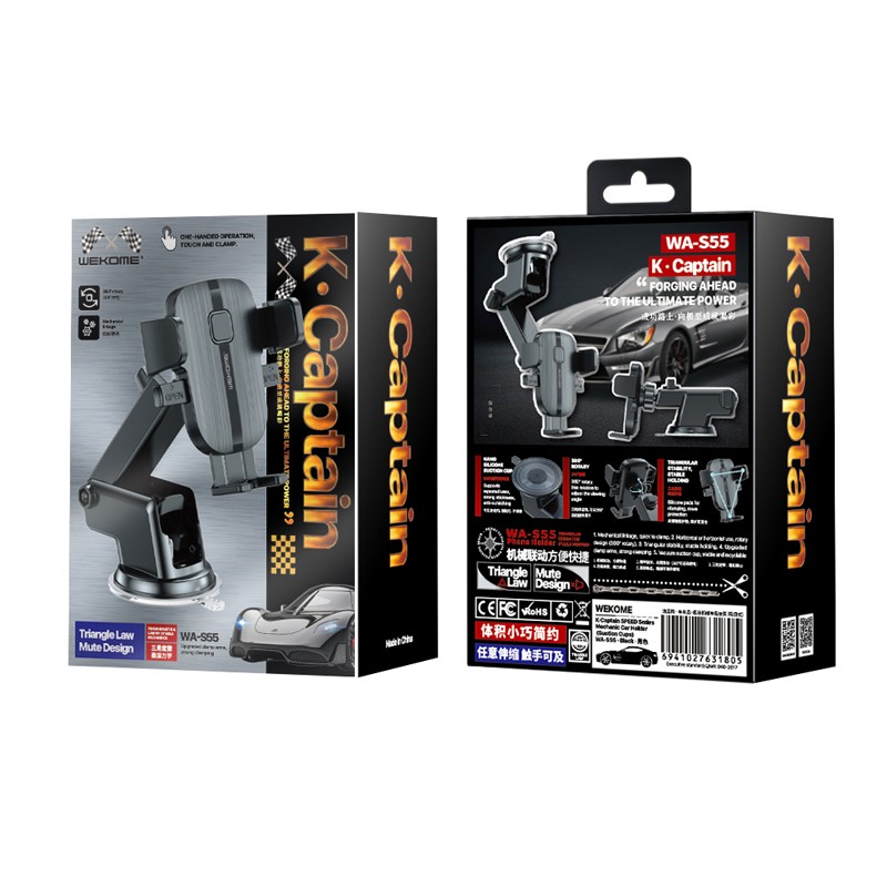 Uniwersalny uchwyt samochodowy WEKOME WA-S55 K Captain Series montowany do deski rozdzielczej w samochodzie. Idealne rozwiązanie dla osób poszukujących trwałego i stabilnego uchwytu na telefon na każdą podróż.