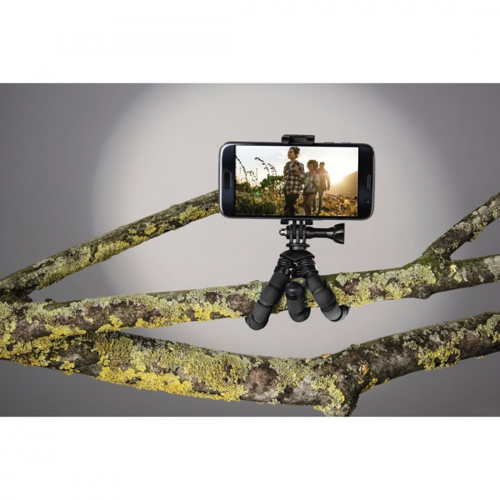 Elastyczne nogi zginane pod kątem 360° do optymalnego i bezpiecznego ustawiania na różnych przedmiotach, np. poręczach, gałęziach System 2w1 do smartfonów i kamer GoPro Kompaktowy format, idealny do stosowania w podróży, na urlopie, na wycieczkach plenerowych