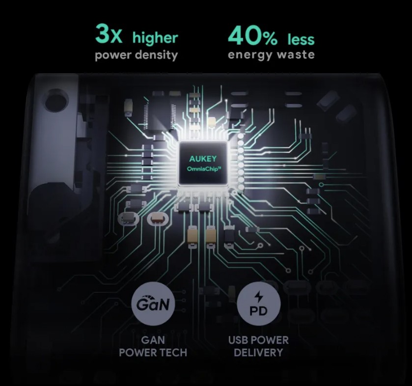 Najnowszym rozwiązaniem, które znalazło się w dwuportowej ładowarce Omnia GaN PA-B2 Mini jest OmniaChip Aukey, zaawansowany układ scalony mocy GaN. Dzięki wykorzystaniu azotku galu (GaN) udało się zmniejszyć zarówno wymiary, jak i wagę ładowarki, jednak bez żadnej szkody dla jej niezwykłej funkcjonalności. Przypomnijmy: prezentowany model umożliwia nawet trzykrotnie szybsze ładowanie kompatybilnych z nim urządzeń.