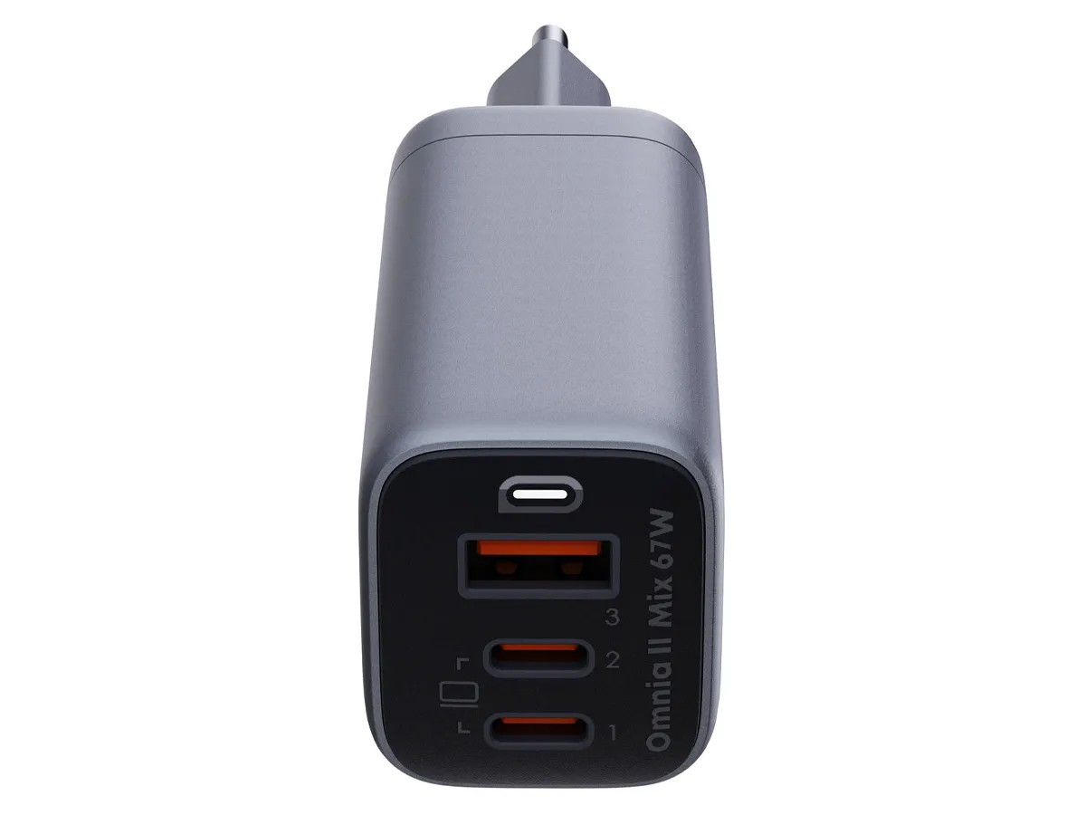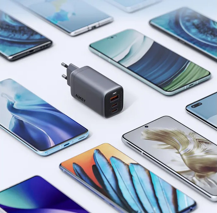 Aukey Omnia II GaN Mix PA-B6U to mała, ale mocna ładowarka z 3 portami, która jest zaprojektowana dowolne urządzenia obsługujące Power Delivery - od smartfonów po MacBooki. Każdy z 2 portów USB-C ma moc 67 watów, a port UBS-A obsługuje Quick Charge 30 W.