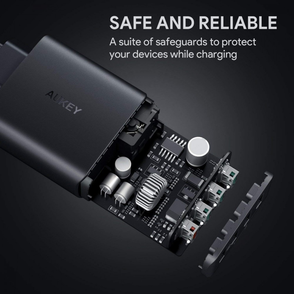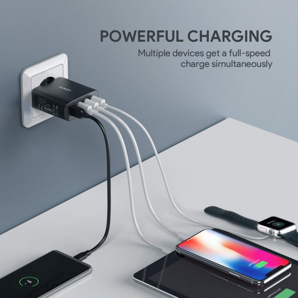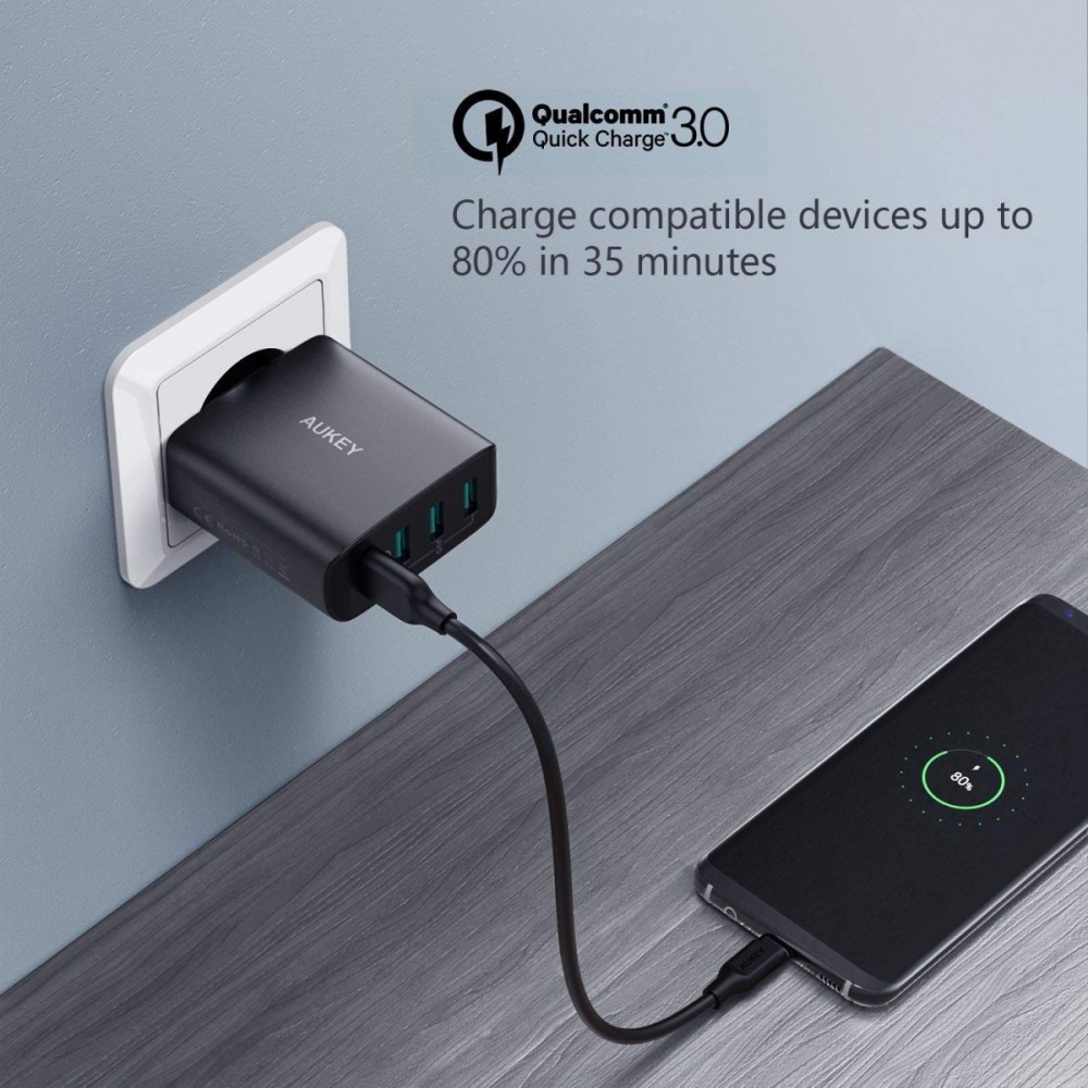 AUKEY PA-T18 Ładowarka sieciowa 42W 10.2A 4xUSB Quick Charge 3.0 Ładowarka posiada certyfikat Qualcomm Quick Charge 3.0 i wykorzystuje zaawansowaną technologię Qualcomm INOV (inteligentna, adaptacyjna kontrola optymalnego napięcia) dzięki czemu naładuje urządzenie nawet 4 razy szybciej niż w przypadku standardowych ładowarek i 38% bardziej efektywne niż Qualcomm Quick Charge 2.0 Qualcomm Quick Charge 3.0 jest w pełni kompatybilne ze starszymi wersjami Qualcomm Quick Charge 2.0 oraz Qualcomm Quick Charge 1.0 Jeżeli Twoje urządzenie nie wspiera technologii Quick Charge, ładowarka zwolni i naładuje je z maksymalną bezpieczną szybkością