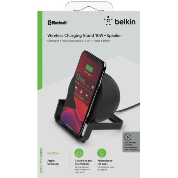 Ładuj podczas słuchania muzyki i odbierania połączeń. Bezprzewodowa ładowarka + głośnik BOOST CHARGE to kompaktowe urządzenie wielofunkcyjne. Uprość ładowanie i rozrywkę, od szafki nocnej po biurko. Parowanie jednym przyciskiem. Ładuj podczas słuchania muzyki i odbierania połączeń Szybkie bezprzewodowe ładowanie do 10 W opracowane dla Qi i zoptymalizowane dla smartfonów iPhone, Samsung, LG, Sony i Google Świetnie brzmiący głośnik idealnie nadaje się do odtwarzania muzyki lub przesyłania strumieniowego filmów Parowanie jednym dotknięciem ułatwia łączenie Ładuj bezprzewodowo w dowolnej orientacji Kompatybilny z większością lekkich futerałów plastikowych, nie ma potrzeby wyjmowania futerału w celu naładowania. Kompaktowa konstrukcja idealnie nadaje się na stolik nocny lub biurko