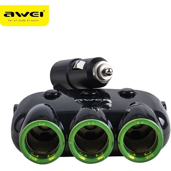 AWEI C-3S - Kompaktowy rozdzielacz z dwoma wejściami USB i trzema rozgałęzieniami gniazda zapalniczki samochodowej.