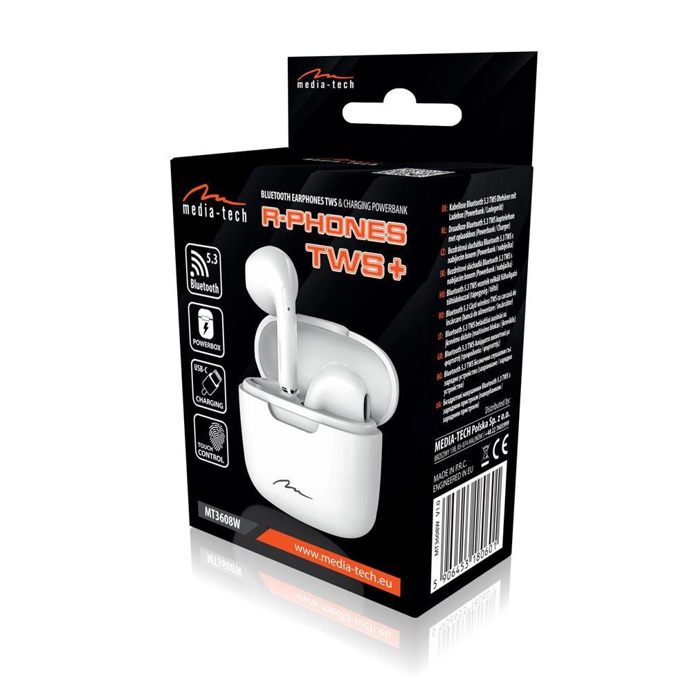 Media-Tech R-PHONES TWS+ MT3608 to bezprzewodowe słuchawki douszne dostępne w dwóch wersjach kolorystycznych, czarnej i białej. Łączą one w sobie najnowocześniejsze technologie z wysoką jakością wykonania.