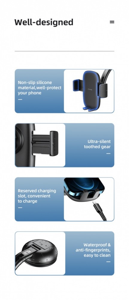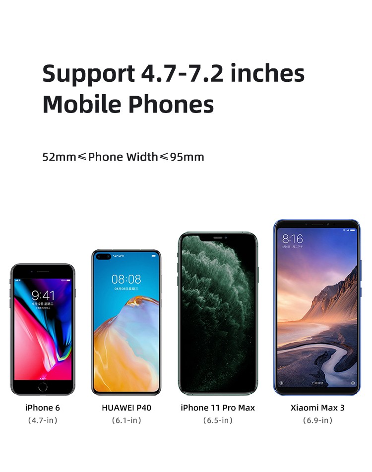 Pozostałe parametry: Materiał: ABS + silikon; Nadaje się do: telefonów komórkowych 4.7-7.2 cala Zakres zacisku: 52-95mm Mocowanie: deska rozdzielcza, przednia szyba