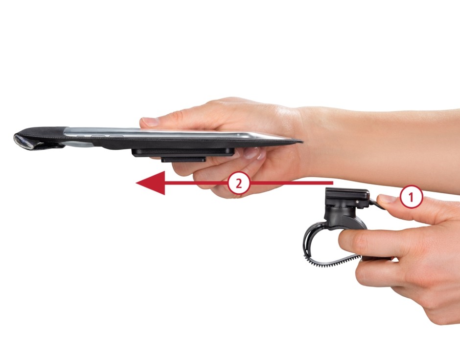 Wystarczy jeden klick, aby zamocować futerał na kierownicy. Futerał wystarczy wsunąć w prowadnice i gotowe! Bardzo prosty sposób montażu sprawia, że futerał w każdej chwili można odczepić od uchwytu.