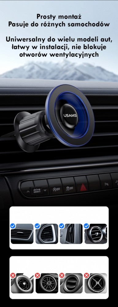 USAMS ZJ081 to elegancki i praktyczny magnetyczny uchwyt samochodowy do telefonu, przeznaczony do montażu w kratce nawiewu. Wykonany z wysokiej jakości akrylu i silikonu, łączy w sobie trwałość, estetykę i funkcjonalność.