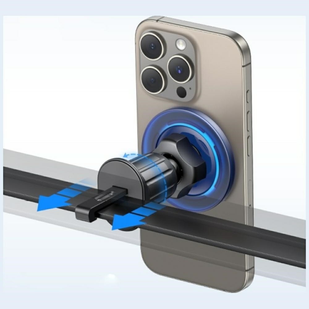 Kompaktowa konstrukcja nie zajmuje wiele miejsca w kabinie, a mocny magnes z systemem automatycznego centrurowania zapewnia stabilne utrzymanie smartfona nawet podczas jazdy po nierównych drogach, umożliwiając jednocześnie łatwe zakładanie i zdejmowanie urządzenia jedną ręką. Mechanizm kulkowy pozwala na obrót w pełnym zakresie 360 stopni, co ułatwia ustawienie telefonu w pozycji pionowej lub poziomej, zapewniając optymalny kąt widzenia podczas korzystania z nawigacji.