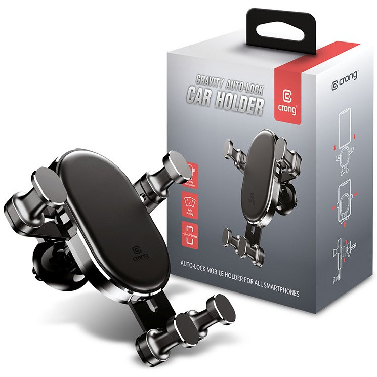 Grawitacyjny uchwyt samochodowy do smartfonów 4,7-6,5 wyposażony w system Auto-Lock. Zintegrowany mechanizm domyka się samoczynnie pod wpływem ciężaru telefonu, dzięki czemu pozostaje on zabezpieczony na czas podróży autem. Wszystkie cztery łapki uchwytu zostały dodatkowo wyprofilowane w taki sposób, aby telefon nie wypadał podczas hamowania i można go było wozić w uchwycie z założonym etui ochronnym.