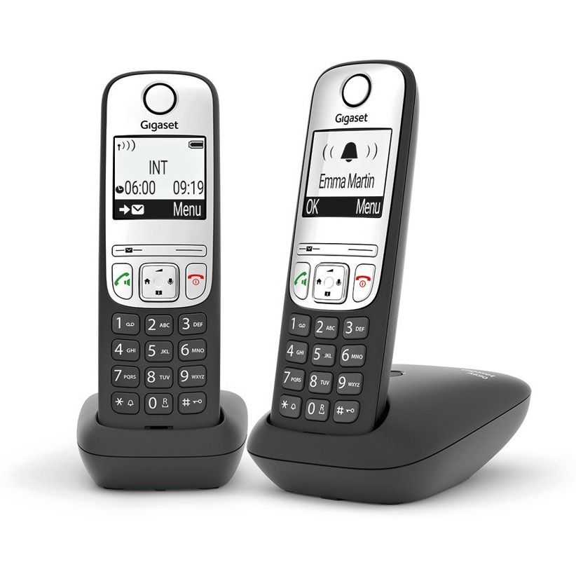 Telefon bezprzewodowy Gigaset A690 Duo Kontrastowy, podświetlany, czarno-biały wyświetlacz graficzny 2" Meldowanie do 4 słuchawek (w zestawie 2 słuchawki) Tryb głośnomówiący o najwyższej jakości dźwięku Książka telefoniczna z możliwością zapisania do 100 abonentów wraz z numerami Identyfikacja numeru dzwoniącego dla połączeń przychodzących oraz listy połączeń Lista 25 ostatnich połączeń nieodebranych z numerem, nazwą i godziną połączenia Powtarzanie wybierania ostatnich 10 numerów Tryb wybierania : DTMF i impulsowy Blokada klawiatury przyciskiem (#) Wyłączanie dzwonka przyciskiem (*) Programowany czas Flash Czarna lista blokująca niepożądane połączenia z maksymalnie 32 numerów Dwie słuchawki w zestawie Bezpłatne rozmowy wewnętrzne Plug & play bardzo łatwa instalacja: rozpakuj, podłącz i dzwoń (słuchawki fabrycznie zalogowane w bazie telefonu)