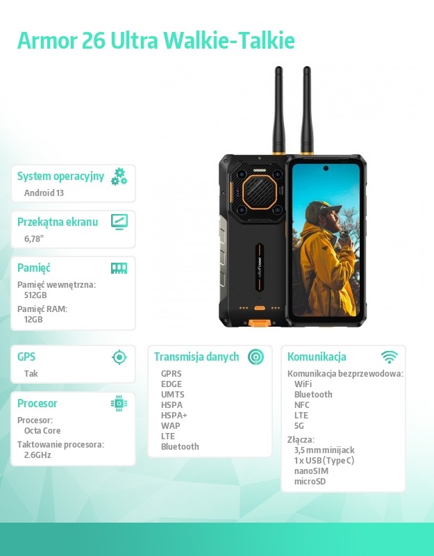 Armor 26 Ultra to nie tylko wytrzymały smartfon, ale także potężna krótkofalówka przydatna w wielu różnych obszarach, takich jak logistyka, transport, turystyka i aktywność na świeżym powietrzu, ratownictwo, przemysł, rybołówstwo i leśnictwo, kopalnie węgla czy place budowy. Dzięki mocy wyjściowej 3W i głośności 121 dB, głośnik 34 mm zapewnia wysokiej jakości, czysty i dynamiczny dźwięk.