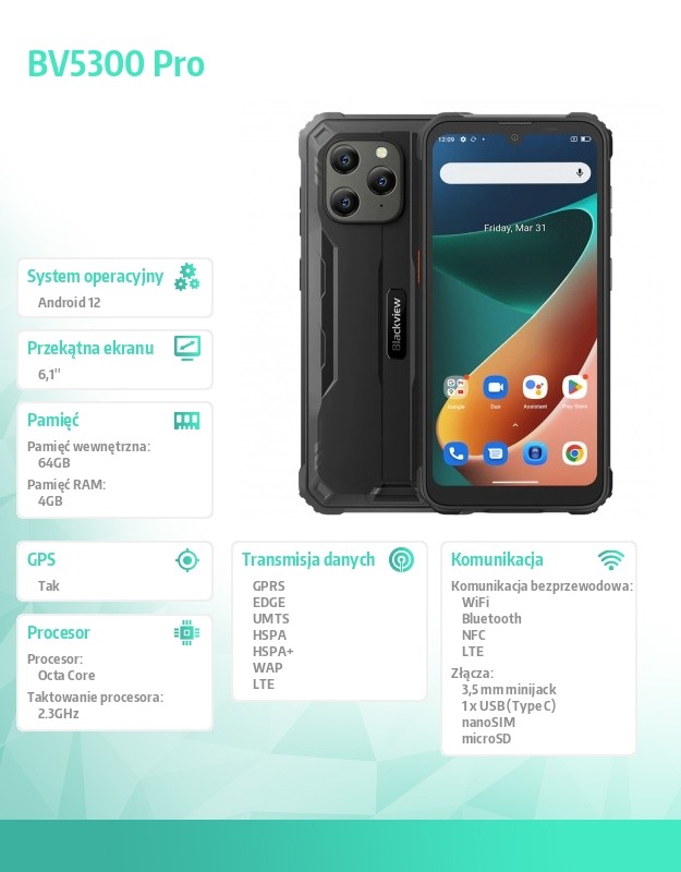 Blackview BV5300 Pro posiada ośmiordzeniowy procesor MediaTek Helio P35, który gwarantuje szybką i płynną pracę. Na pokładzie znajduje się również 4 GB pamięci RAM, a także 64 GB pamięci masowej, z możliwością rozbudowy do 512 GB kartą pamięci.