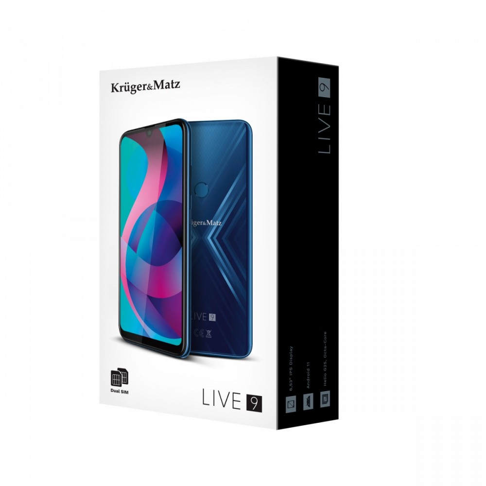 Potrzebny jest Ci smartfon z dużym wyświetlaczem? 9. odsłona smartfonów z serii Kruger&Matz LIVE to model wyposażony w 6,5-calowy wyświetlacz HD+ w proporcjach 19:9. Poczuj wysoki poziom komfortu, zarówno podczas przeglądania stron internetowych, jak też korzystania z różnych aplikacji.