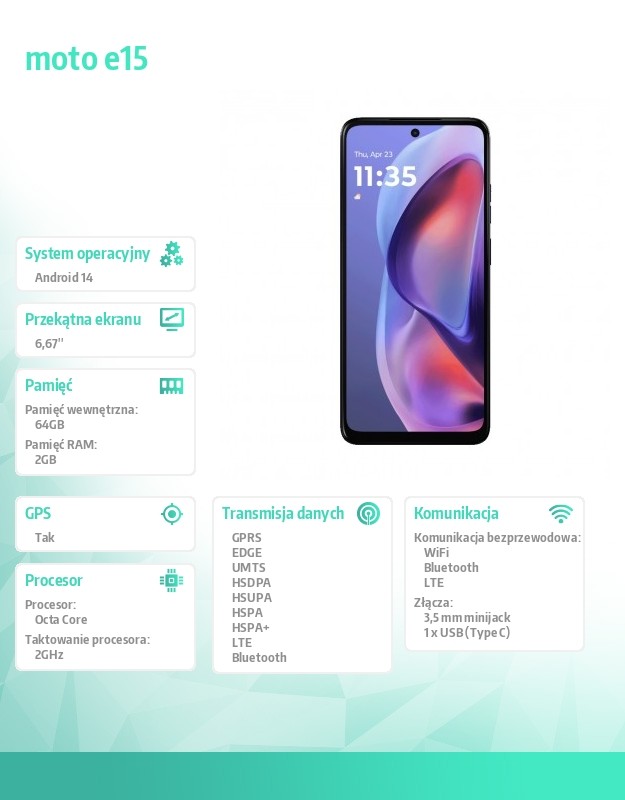 Akcesoria w zestawie: moto e15 Kabel USB typu C Instrukcje Klucz do karty SIM Etui ochronne