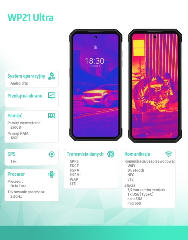 WP21 Ultra jest pancernym smartfonem, który poradzi sobie nawet w najcięższych warunkach. Jest odporny na upadki, wstrząsy, pył oraz wodę, co pozwala na swobodne korzystanie z niego w każdej sytuacji. Posiada certyfikaty wytrzymałości IP68, IP69K a także militarny MIL-STD-810G.