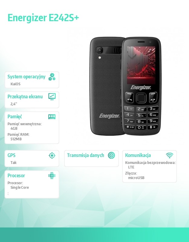 Energizer E242S+ to wszechstronny telefon, który łączy tradycyjny design z nowoczesnymi funkcjami. Zaprojektowany z myślą o codziennych potrzebach, oferuje trwałość, wygodę i niezawodność, będąc idealnym towarzyszem zarówno w pracy, jak i w podróży.