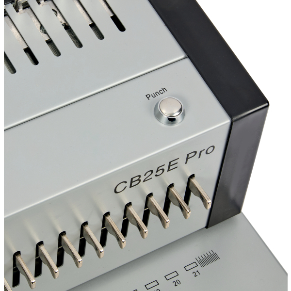 CombBind CB25 Pro to wytrzymała elektryczna bindownica grzebieniowa przeznaczona do umiarkowanej eksploatacji w biurach, w szkołach lub w domu. Regulacja ustawienia bolców dziurkujących pozwala na łatwe dopasowanie do różnych formatów papieru, nie większych niż A4, oraz umożliwia dostosowanie głębokości marginesów. Urządzenie zaprojektowane jest z myślą o łatwej obsłudze i wyposażone w wygodną tackę, która zapewnia łatwe opróżnianie ścinków. Dziurkuje jednocześnie do 25 kartek A4 o gramaturze 70 g/m i binduje do 500 kartek przy użyciu grzbietów plastikowych o średnicy 51 mm. Kolor srebrny.