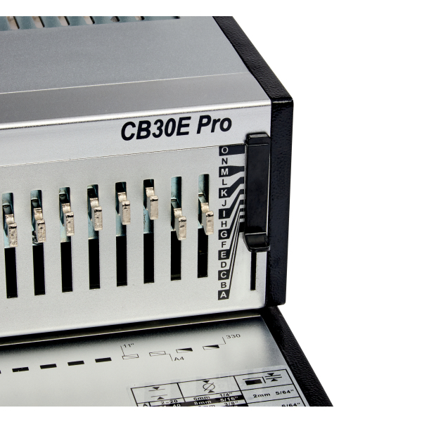 CombBind CB30E Pro to solidna i wytrzymała elektryczna bindownica grzebieniowa przeznaczona do umiarkowanego i intensywnego użytkowania w biurach, w szkołach lub w domu. Regulacja ustawienia bolców dziurkujących pozwala na łatwe dopasowanie do różnych formatów papieru, nie większych niż A4, oraz umożliwia elastyczne dostosowanie głębokości marginesów. Urządzenie zaprojektowane jest z myślą o łatwej obsłudze i wyposażone w wygodną tackę, która zapewnia łatwe opróżnianie ścinków. Dziurkuje jednocześnie do 30 kartek A4 o gramaturze 70 g/m i binduje do 500 kartek przy użyciu grzbietów plastikowych o średnicy 51 mm. Kolor srebrny.
