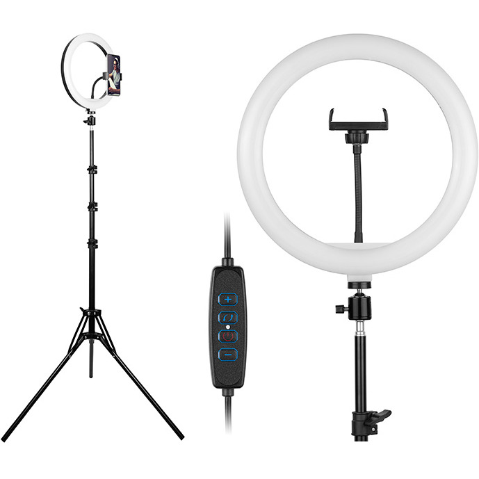 Lampa LED 12 / 30cm ze statywem 210cm Podłogowa, wzbogacona o ilość LEDów, wersja lampy pierścieniowej Tracer RING, dedykowana dla osób wymagających większej mocy i większych możliwości regulowania położenia źródła oświetlenia.