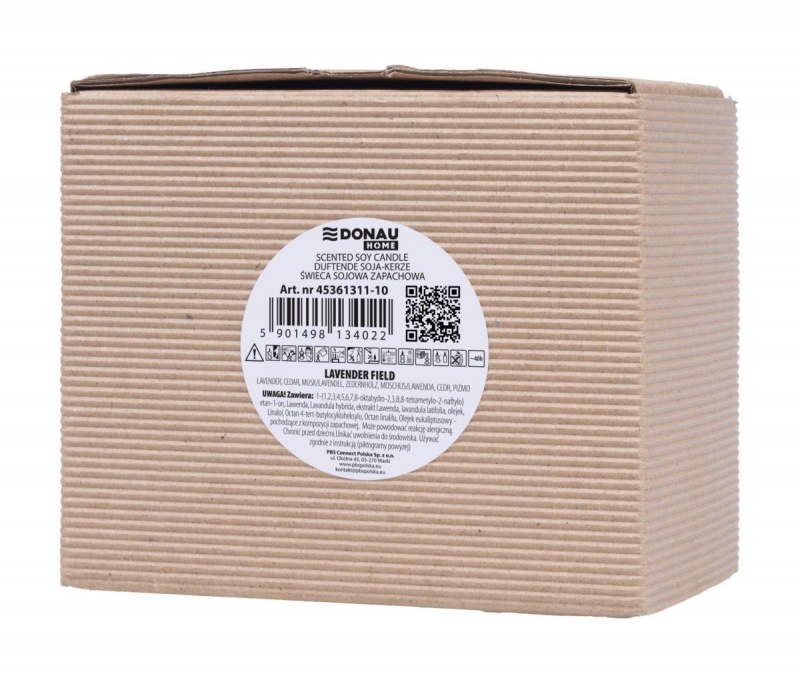 Świeca sojowa DONAU HOME, w szarym szkle, drewniana pokrywa i knot, Lavender Field, 200g