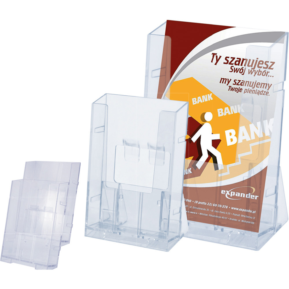 Stabilny stojak na ulotki A6 wykonany z wysokiej jakości lanego akrylu. Odporny na zarysowania. Konstrukcja umożliwia łączenie z boku lub z tyłu.