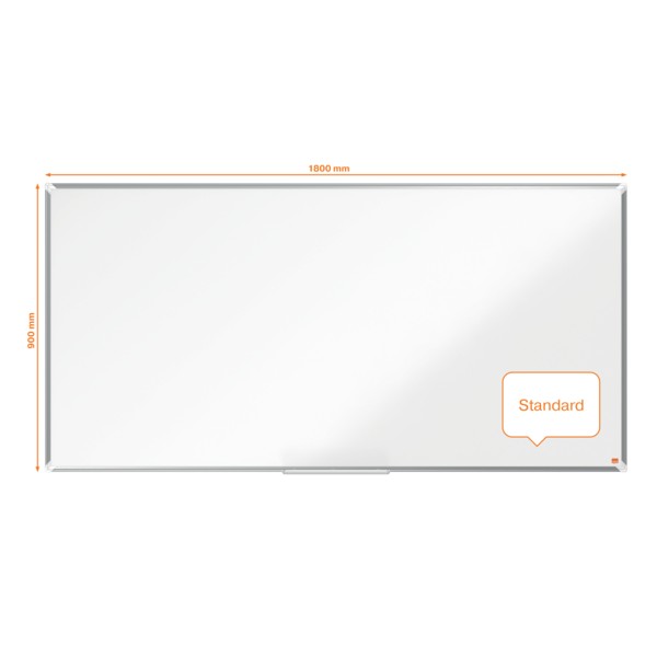 Stalowa magnetyczna tablica suchościeralna z elegancką i stylową ramą z aluminium. Mocowana do ściany w narożnikach. Z pojemną półką umożliwiającą wygodne przechowywanie markerów i gąbek. Magnetyczna powierzchnia tablicy wykonana ze stali lakierowanej zapewnia wyższy poziom ścieralności przy częstym użytkowaniu. Rozmiar: 1800 x 900 mm.